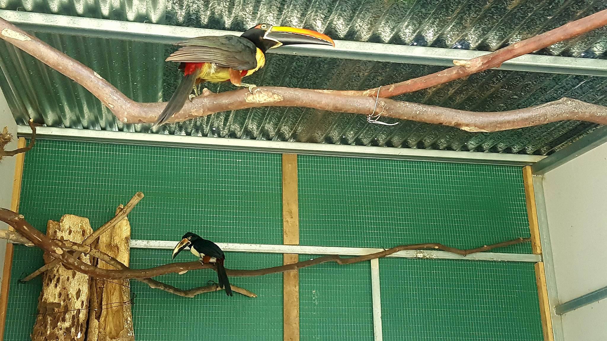 In my opinion, working at the Ranch is a big responsibility and also a big pleasure. Seeing an animal grow stronger each passing day and recuperate from a bad situation is definitely a calling. This is what happened with two of our residents, the collared aracari and the fiery billed aracari. The collared aracari that joined us in February, had just escaped from being kept as a pet. His situation was evident. His back feathers were a dull gray compared to the iridescent black of a wild specimen. His chest was a pale white instead of the almost neon yellow characteristic to his species, and his beak was discolored as if drained of life. He started recuperating almost immediately. The protein we provided in his new diet and the attention he received started slowly turning his plumage brighter and brighter, until the day came when he finally was allowed outside the clinic and into a big enclosure with his own species. The transition process didn’t go so well though. The other collared aracaris weren’t so keen on accepting our little friend, so he was sent back to the clinic. That changed when we saw him interacting with another fiery-billed aracari who was also in the clinic. Hopeful plans were made as we put both aracaris into an enclosure of their own. Happily, they’ve accepted each other and now share this wonderful living space together at TRR.