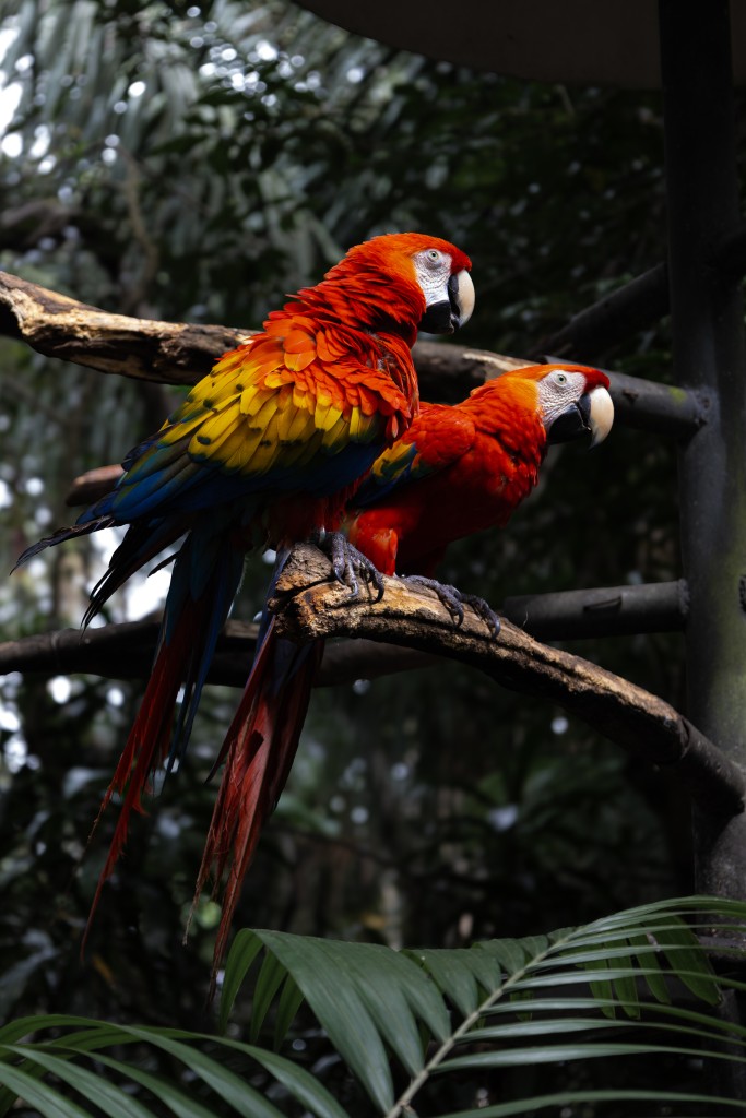 Inspiration: Hice la visita a un centro de rescate donde se encontraban estas lapas y estaban muy juntas, la imagen me cautivo profundamente debido a sis colores y el contraste con la vegetación oscura del fondo