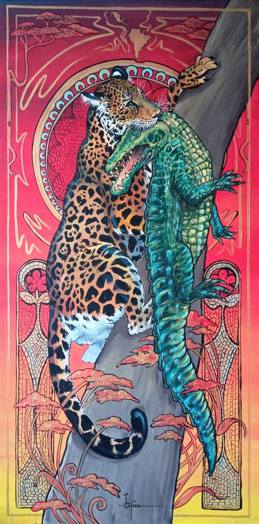 Inspiration: Mi obra se centra en los animales amenazados y en especial, aquellos presentes en Latinoamérica. El jaguar, por ser una especie sombrilla en su ecosistema, además de por su innegable belleza, siempre me ha fascinado. Y esas escenas del gran felino, lanzándose con su pesada agilidad al agua turbia para matar de una mordida a otro gran depredador son algo mágico, la naturaleza supera siempre la ficción.